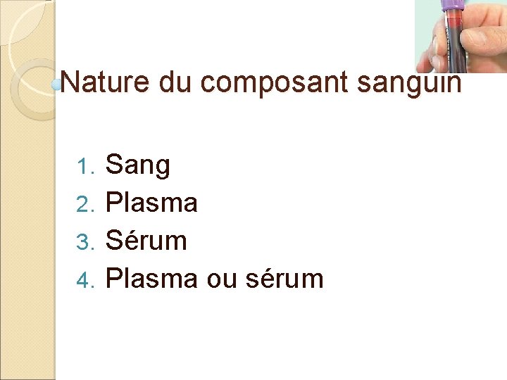 Grands brûlés, hémophiles, patients souffrant de le plasma est utilisé sous deux formes :